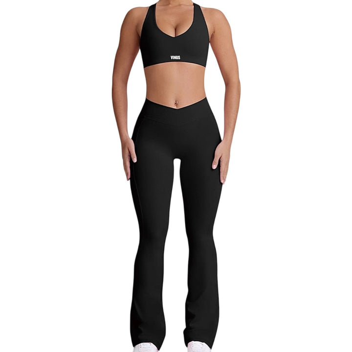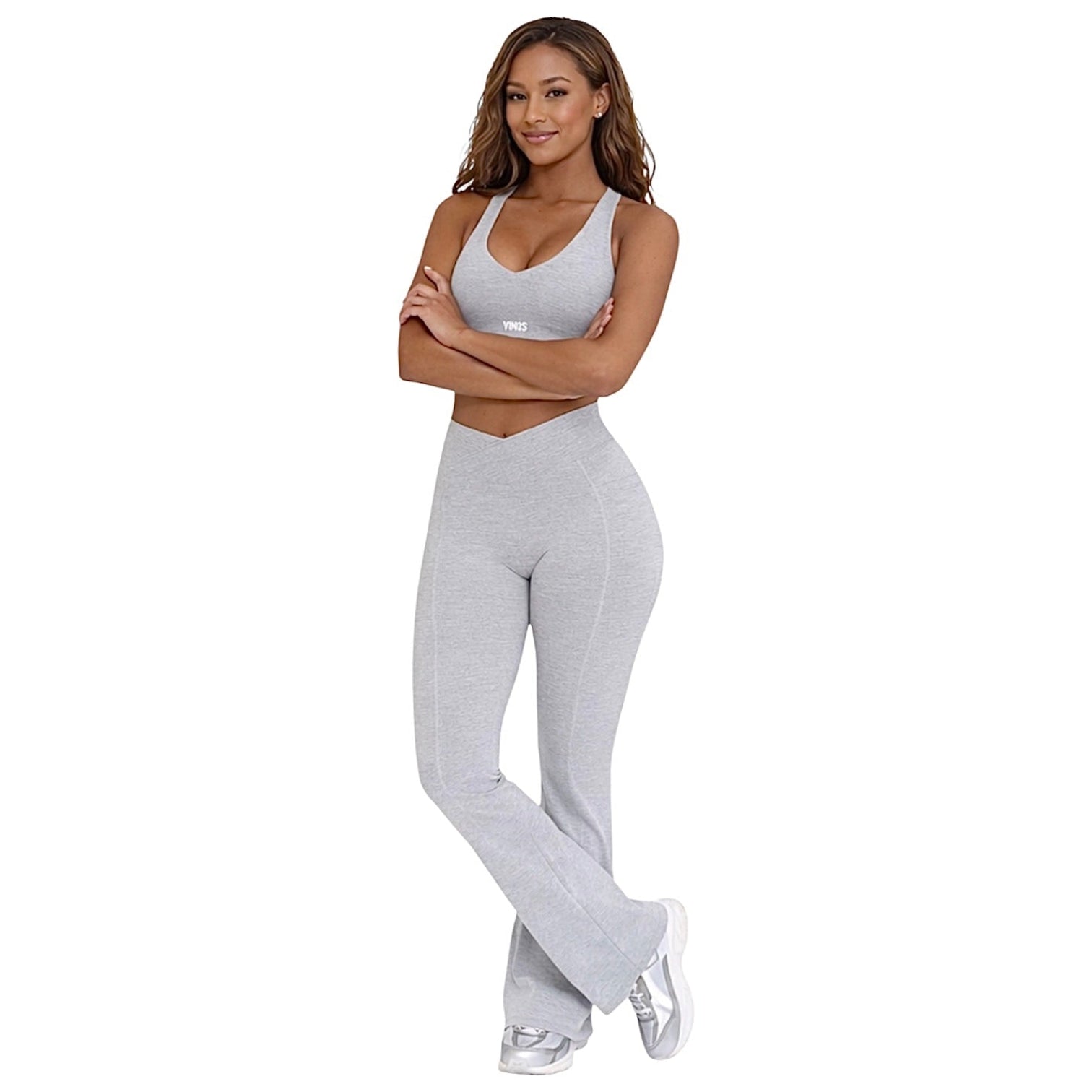 The SELENA FLARE SET combines style and function for your active lifestyle. This padded sports bra features an eye-catching heart cutout on the back, while the matching flare leggings offer practical side pockets and a flattering subtle V-waist. Crafted from stretchy, comfortable fabric that fits true to size, this set transitions seamlessly from gym sessions to everyday errands. Available in timeless heather gray and black, elevate your workout wardrobe with a piece that doesn't compromise on comfort or fashion.